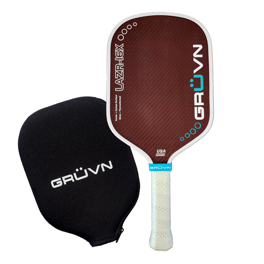 GRUVN's LAZR-16X (eXtended shape) is a high-performance, all-court elongated paddle with a Kevlar-carbon fiber blend surface. This thermoformed, mid-weight paddle has plenty of power to go along with optimal control, durability, and maximum spin (2214 RPM!). It is approved by USA Pickleball (USAPA) for tournament play. The LAZR-16X has more ball dwell time and is a strong, stable paddle with consistent and accurate shots. This model comes with two color options: red blend and blue blend. DuPont™ and Kevlar® are trademarks or registered trademarks of affiliates of DuPont de Nemours, Inc.