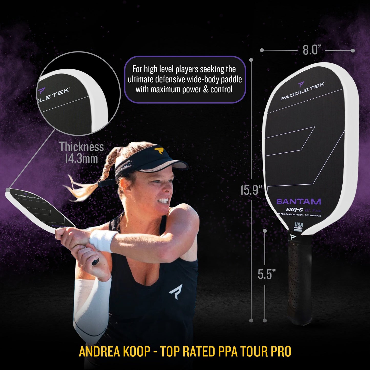 The Bantam ESQ-C was designed in collaboration with pickleball pro, Andrea Koop, to provide a combination of power, spin, and forgiveness. PT-700 unidirectional RAW carbon fiber is combined with our more powerful 12.7mm Bantam core to give serious players controllable power and spin capability. A 5 1⁄2” handle reduces wind drag and allows for a two-handed backhand, while a large, consistent sweet spot adds finesse to every shot. DISCLAIMER: The Bantam ESQ-C (Esquire) will not be held liable for any distress incurred by your opponent. Court is in session.