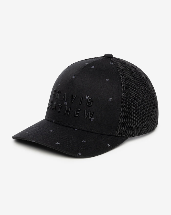 Back in black—with a little extra somethin’ somethin’. And that somethin’? It’s an all-over geo print pattern with the perfect pop of color for our black-on-black SHIPWRECK BEACH mesh snapback hat.